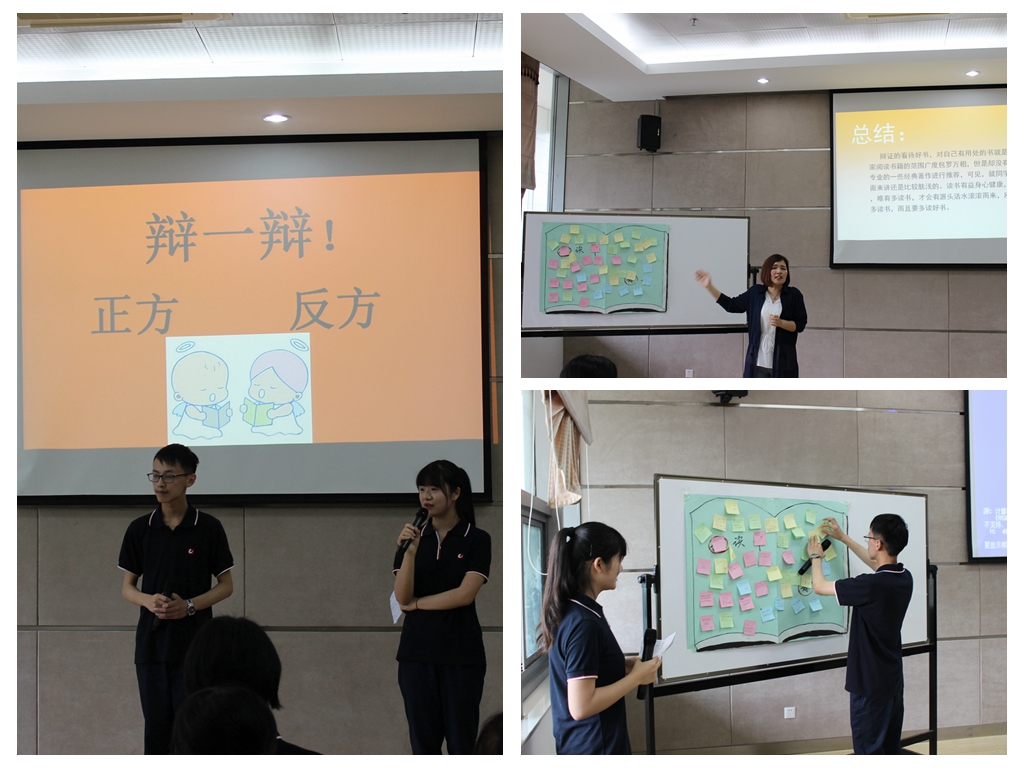 以“读书节”为主题的班会有会计系1512班、1412班和金融系1406班。1512班的《我与书本有个约会》主题班会分为“书籍知识”、“诵读经典”、“好书推荐”、“互动交流”和“老师箴言”五个环节,每个环节都做了精心的设计和安排。主持人从“世界读书日”的由来切入,除推荐了许多经典好书外,同学们还别出心裁地推荐了《地书》和《答案之书》两本不同于传统书籍的“神奇”之书,并和同学们进行了现场交流体验。此外,同学们自编自导自演自制的情景剧《入迷》取材于日常生活,生动形象地再现了电子书阅读与现代生活的关系,启发同学们思考。学生参与度广、原创资源丰富是1512班本次主题班会的两大亮点。1412班除了介绍“读书节”的来历外,还介绍了许多名人读书的案例,如“司马光警枕励志”、“华罗庚的猜读法”、“毛泽东挤出一切时间看书”、“扑在书里的高尔基”等等。1406班的《好读书,读好书》主题班会以“今天你刷微博了吗?今天你刷QQ空间了吗?今天你刷朋友圈了吗?今天你读书了吗?”四个问题切入,一开场便引发了同学们对自己日常生活和“读书”的思考。整个班会中还贯穿了“我们为什么要读书”、“不读书的弊处”、“读书的渠道”“怎样选择一本适合自己的好书”几个问题,用辩证的方法阐明了班会的主题——多读书,读好书。其中,“关于读书”的校内采访视频和同学们的读书心得分享拉近了书本与同学们之间的距离。