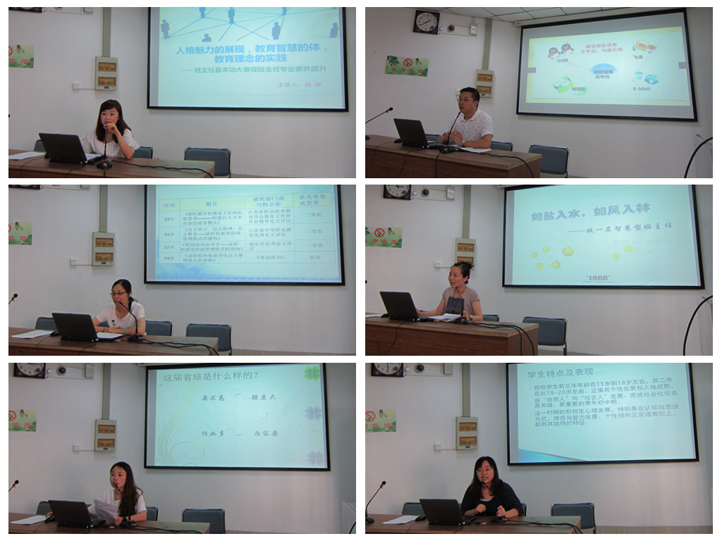 紧接着,班主任代表同与会老师进行了经验交流。孙国梁老师通过“互联网+”这关一键词,结合“互联网+”时代“95后”、“00后”的特点,讲述了互联网在班级信息发布平台、班级文化阵地建设、利用网络课堂进行他人德育教育等方面的作用。孙老师还分析了网络时代班主任工作的新特点和班主任角色定位的新变化,为“互联网+”时代的班主任工作做了指引。邱源老师从参与班主任基本功大赛的经历说起,介绍了班主任基本功大赛的背景,对参赛项目进行了解读了,并分享了自己的参赛感悟。邱老师认为,班主任基本功大赛促进了班主任专业素养与德育能力的提升,她结合赛场的案例解读了大赛在“双核”(即班主任自身教育理论实践与理念实践反思的核心能力)、“两升”(即班主任人格魅力提升,情感素质优化管理技能提升)和“两合”(即施展“教育智慧”,渗透“创业教育”形成教育驱动合力)等方面对班主任工作的促进作用。薛美红老师结合自己科研之路,就“科研对班主任工作的成长”同班主任们进行了深入交流。关于“怎样做班主任科研”的问题,薛老师认为,要有科学的精神,要深入地了解学生,要善于发现有价值的问题,要科学生动地表达自己的思考,并一一进行了详细阐述。郭艳秋老师用“优势”、“预谋”、“偶发”、“特殊”四个关键词,阐释了如何做一名智慧型班主任。坚持和学生用周记交流、统一管理手机的约定、处理突发事件时科学有效的方法、对待特殊学生的接纳和等待......这一个个生动、真实的案例,满含着郭老师的教育智慧和管理智慧。曹金融老师介绍了自己在暑假参加“2016江苏省职业学校班主任提高培训”的收获和体会。面对“要求高、强度大、内容杂、作业多”的省培,曹老师坦言收获满满。关于省培后的思考,曹老师提出了“品质为先、团队和谐、专业为王、技巧纯熟、注重实践、善于总结和与时俱进”七个方面的体会与老师们共勉。最后,学校心理健康教育中心的陶君老师做了题为《学生常见心理状况和指导》的讲座。陶老师分析了职校学生的特点及表现和常见不良心理及表现,建议班主任老师们可以采用合理有效的“心育”技术,促进学生自我成长,如沟通——让学生学会理解;激励——让学生学会进取;体验——让学生学会合作;干预——让学生获得支持等等。在面对问题学生时,陶老师建议班主任们首先要控制自身情绪,冷静处理问题,耐心倾听学生;其次是坚持个别和集体辅导多方式的处理;当遇到复杂棘手的情况时,也可及时向学校心理健康教育中心求助。