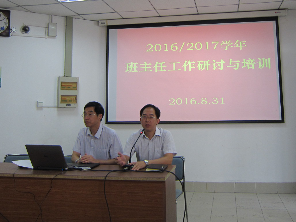 8月31日下午,南京财经高职校、女专2016/2017学年度班主任工作研讨与培训在莫愁路校区阶梯教室举行。陈旭辉校长、谭少立书记、仇国宏副书记、陈浩副校长、学工部、团委、各系负责学生工作的中层干部和老师及全体班主任出席了本次会议。会议由原财校学工部许鸣峰主任主持。