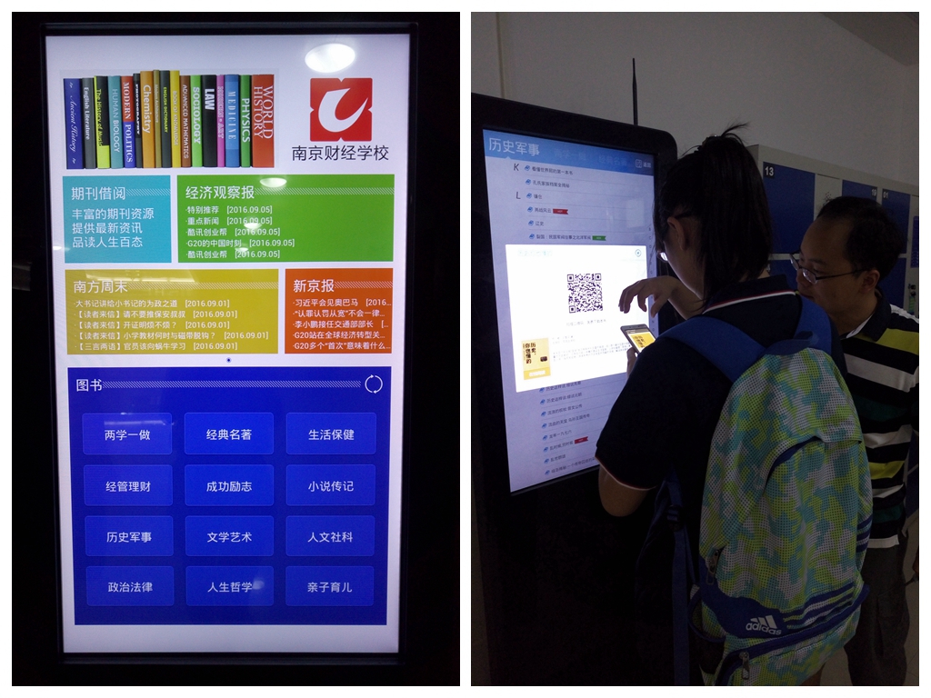 此款借阅机为纯自助电子书籍借阅机,外形有一人多高,看起来像是一台超大版的智能手机。该机通过多点触控进行操作,支持滑动、拖动等手势。师生只要用手指轻轻地点击显示屏上的图片就能实现对主机的操作。电子书借阅机利用时下流行的二维码技术,开创了独特新颖的图书借阅方式。同学们只需使用微信“扫一扫”借阅机上图书封面上的二维码,便可下载电子版书籍,随时随地轻松阅读。