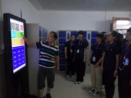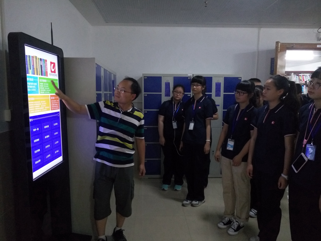 9月4日下午,学校江宁校区行政楼二楼的图书馆门前人头攒动。原来是图书管理员冯亮老师正在向16级的新生同学们介绍图书馆的一位“新朋友”,这就是学校首次引入的歌德电子借阅机。