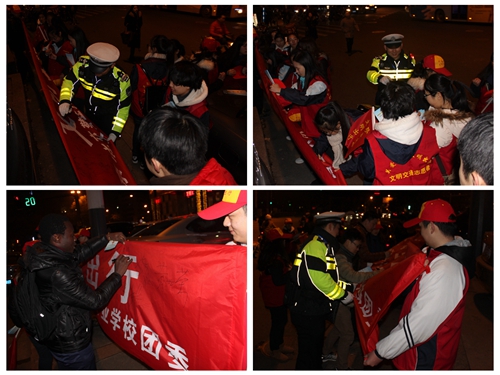 在昏黄的灯光下,三名男同学冒着烈烈寒风拉起了“文明交通,安全出行”的横幅提醒过往路人,四名女同学一边向行人发放文明出行宣传折页,一边拿着笔邀请他们上前签名。活动一经发起,吸引了很多行人,更有外国友人主动参与其中。大家签下的不仅是一份自我承诺,更折射出自身的文明素质。