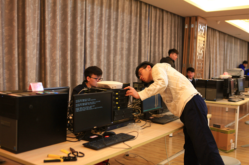 为了做好承办工作,学校成立了专门的竞赛领导小组、竞赛工作小组和赛务工作小组,科学制定大赛各项准备工作方案,精心组织和实施,从媒体宣传、赛程安排、场地准备、设备维护、技术保障、用电安全、后勤服务和环境卫生等各方面着手,确保大赛顺利进行。在各个环节中,赛场设备的搭建和维护是重中之重。为此,学校对112台电脑进行了升级重做系统,对56组网络设备进行调试;同时向厂家借调新加的设备,由于一些设备已经停产,信息艺术系等部门克服诸多困难向兄弟学校借用,仅组建设备的过程前后就花了1个多月时间。在整个比赛过程中,学校还安排了专门的技术人员,做好随时维护赛场设施的准备。一分耕耘一分收获,最终,本次大赛以周到的服务、完善的设备、卫生的环境、精致的管理受到各参赛学校领队、选手的一致好评。