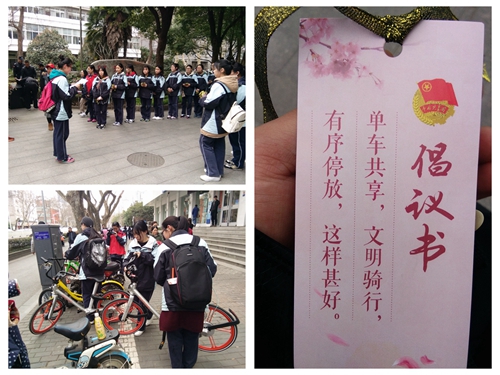 3月3日下午,由秦淮团区委、秦淮区城市管理行政执法大队、朝天宫街道办事处主办的一场别开生面的青年公益宣传活动在紫金广场举行。学校现代服务系15级文秘2班作为学校学生志愿者代表参与了此次活动。下午放学后,2班全体学生分为两组,在班主任吕乾星老师和网络中心胡丽老师的带领下,与朝天宫街道团工委同志一起,针对街道上“共享单车”摆放问题进行了拉网式志愿服务。在一个多小时的活动里,同学们徒步走遍附近的大街小巷,将公共自行车整齐有序地摆放,并在车上悬挂了创意倡议书。志愿者队伍浩浩荡荡的阵势增强了在城市中的影响力,为市民正确使用单车,养成有序停放的好习惯起到了宣传作用。
