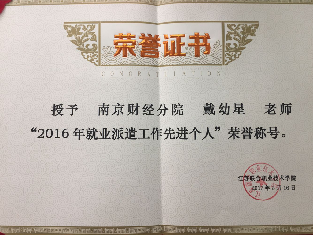 日前,在江苏联合职业技术学院组织的“关于评选2016年就业派遣工作先进个人”活动中,校招生就业培训部戴幼星老师被授予“2016年就业派遣工作先进个人”的荣誉称号。