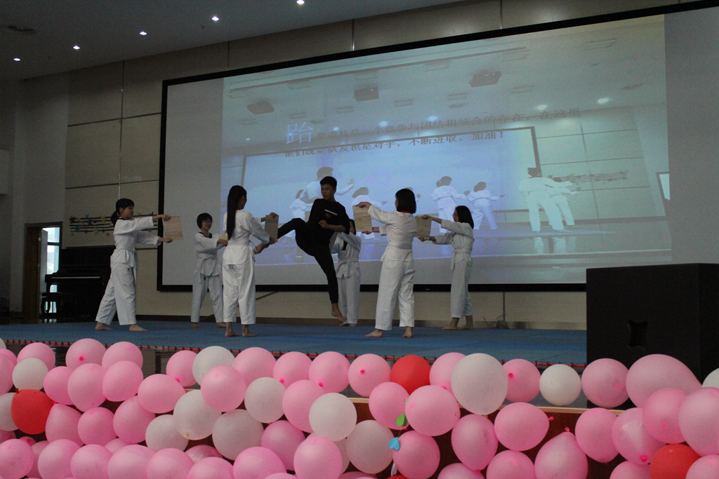 跆拳道社的节目《道》拉开了演出帷幕。他们不仅展示了跆拳道基本的腿法,还展示了飞踢、横踢、后踢等难度动作,以精彩的表演将跆拳道的极速坚韧、谦逊有礼的精神展现的淋漓尽致,赢了台下观众的一片叫好;紧接着,充满青春活力的啦啦操社团配合着动感的音乐为大家奉献了花球和爵士舞蹈表演,点燃了现场观众的热情;足球社用一幅幅社团活动照片展现了他们对足球的热爱,一首《we are one》让喜爱足球的他们表达出了心声;在吉他、钢琴、手鼓的伴奏下,乐队的歌手们用歌曲串烧调动了全场气氛;话剧表演社的《灰姑娘》,虽然没有专业演员的演技精湛,但是大家都尽己所能,还原角色和剧情,一幕幕的场景把观众带入到那个唯美的爱情故事当中……。