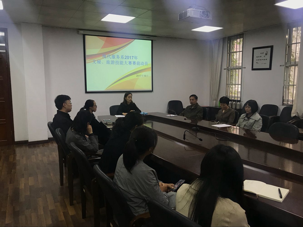 10月16日下午,现代服务系在莫愁路校区会议室举行了技能大赛动员会。会议由现代服务系杨宇净主任主持。杨主任首先就本年度技能大赛的赛程安排和赛事重点进行了阐述。随后,各专业组的带头人发言。旅游组的蔡创老师强调,除了操作等基本技能熟练到位,速度和质量等多维度的协调性也是本次比赛的重点,他们有信心带领学生在西餐摆台、客房布置上取得优异成绩;文秘组老师王志红老师则就现代服务系引入最新亚伟速录进行了简要介绍。会议中,参赛学生认真做着笔记,积极提问,和专业组老师进行互动,取得了良好效果。
