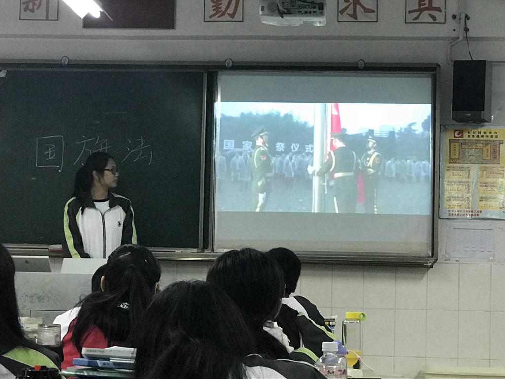 各班班会形式多样,效果显著。同学们踊跃参与,不光学习了国旗法的相关法条,还通过观看开国大典、天安门升旗仪式、齐唱中华人民共和国国歌等方式进一步了解了国旗和国旗法。通过对什么是国旗、国旗的升挂要求、升旗礼仪等方面的进一步学习,同学们更加燃起了心中的爱国热情,纷纷表示爱祖国要从尊重国旗、爱护国旗、文明升旗做起。同时,在“党的十九大”期间,部分班级还利用班会组织观看了“十九大”开幕式,学习习近平总书记作的“十九大”报告内容,进一步增强了国家观念和爱国意识。