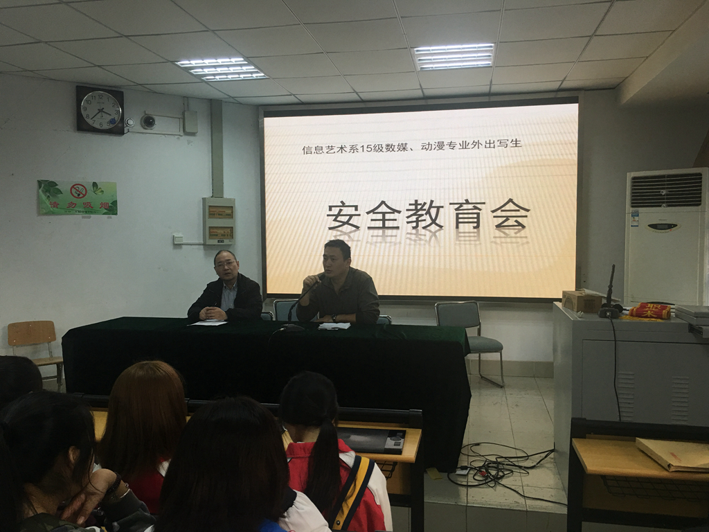 为使将要外出写生的同学们能够更好地适应环境,保证自己的人身安全,10月23日下午,学校信息艺术系在莫愁路校区阶梯教室召开了2015级学生外出写生动员暨安全教育大会。信息艺术系姚金根副主任、后勤工作部张炎副主任、2015级数字媒体专业和动漫专业的各班班主任、专业课教师及学生参加了此次大会。动员大会由姚金根副主任主持。