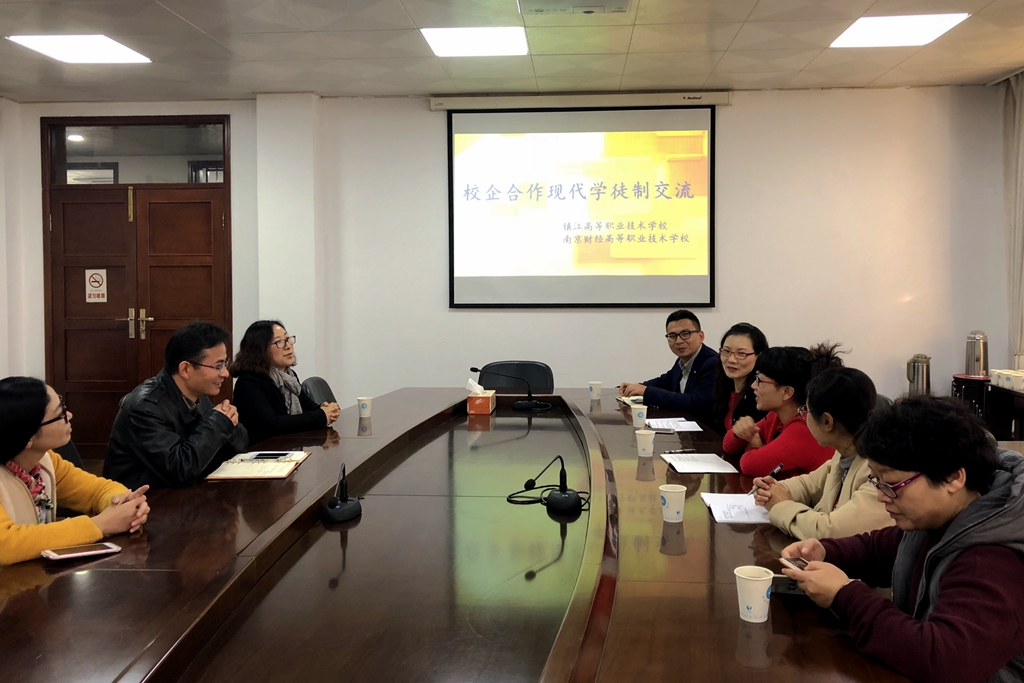 会议伊始,刘副校长对镇江高职校各位领导的到来表示热烈的欢迎,并就学校当前的校区定位做了简单的介绍。随后,周主任详细说明了学校校企合作现代学徒制的发展历程——从一开始的零星邀请企业专家到校授课,安排18名学生下企业实践,到如今集中企业专家、全面展开到各个班级授课。周主任表示,这种人才培养模式有利于学生尽快融入企业,减少企业培训周期。不过,在企业专家授课期间,学校专业教师要协助教学,了解会计岗位所需专业知识,与企业实时对接。镇江高职校的马主任充分肯定了学校目前的人才培养模式。他认为,该模式具有创新价值,值得推广。最后,学校裴畅老师就镇江高职校的各位主任关于师资配备、班级建设、专业建设所提出的问题都进行了一一作答。