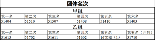 此次校运会分为甲乙两组,14、15级学生为甲组,16、17级学生为乙组,甲乙组均设团体前六名。经过仔细的核算,51404班摘得甲组团体桂冠,51510班获得第二名,51507班获得第三名,51408班获得第四名,51410班获得第五名,51403班获得第六名。31613班获得乙组第一名,51702班获得第二名,51611班第三名,51602班第四名,16文秘(1)和51710班并列第五名。