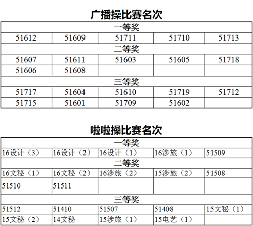 此外,为了培养同学们团结协作的精神,增强班级的凝聚力,此次学校运动会还将16、17级的广播操以及14、15级的啦啦操纳入校运会评比当中。经过评比,51612班、51609班、51711班、51710班、51713班步伐整齐、动作有力、精神饱满,以绝对优势获得广播操比赛一等奖。16设计(3)、16设计(2)、16设计(1)、16旅游(1)、51509班凭借优美的动作、积极热情的精神状态获得啦啦操比赛一等奖。