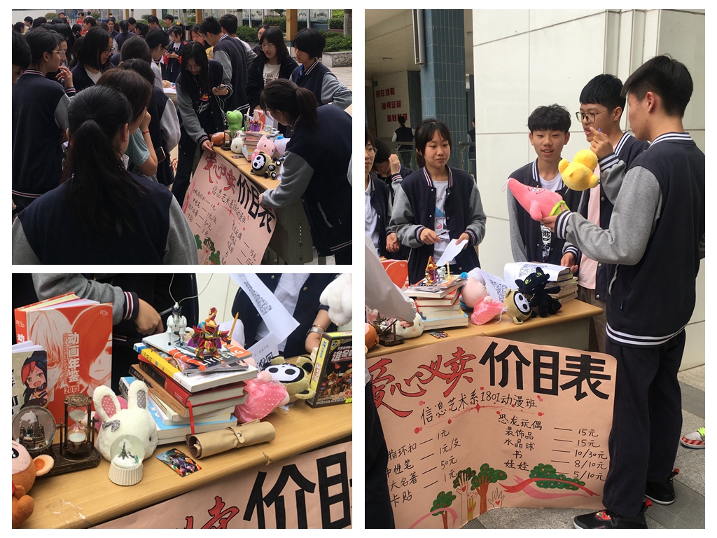 活动开始前,系部老师通过投屏放映、绘制海报等方式进行了活动宣传,呼吁更多的同学前来参与。活动当天,参加义卖的班级学生都准时到达义卖摊位前,将自己宝贵的学习用品、书籍、毛绒玩具、手工艺品等纷纷捐献出来,很快便堆满了展台。活动过程中,许多同学、老师都纷纷驻足,挑选自己中意的义卖品,献上自己的一片爱心。各班的人气都很高,基本上每个班级的爱心展台前“顾客”都络绎不绝,整个校园充满了浓浓的爱意。看着义卖的物品不断地被相中买走,同学们感觉十分有趣,平时生活中比较腼腆的学生,也学着其他同学拿着宣传单向别人介绍,慢慢地也变得不胆怯了,锻炼了自己的交际能力。