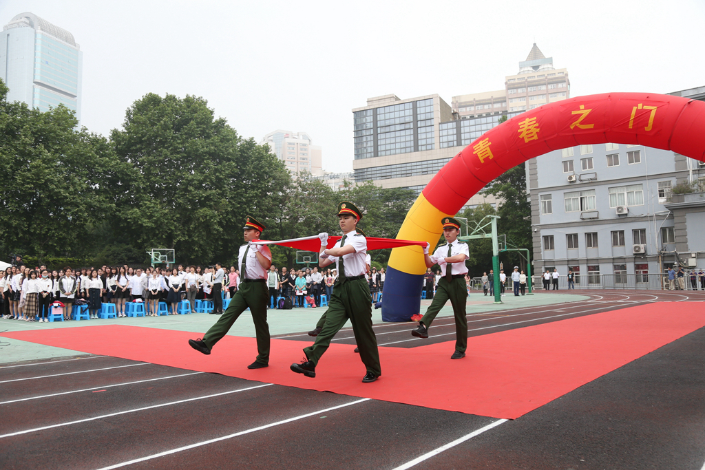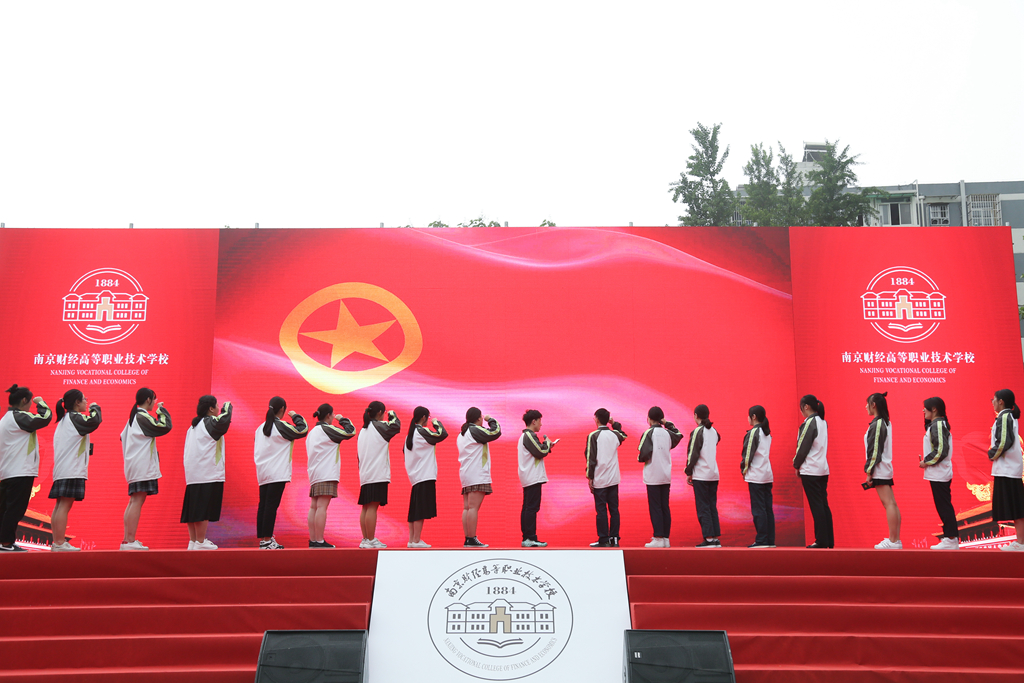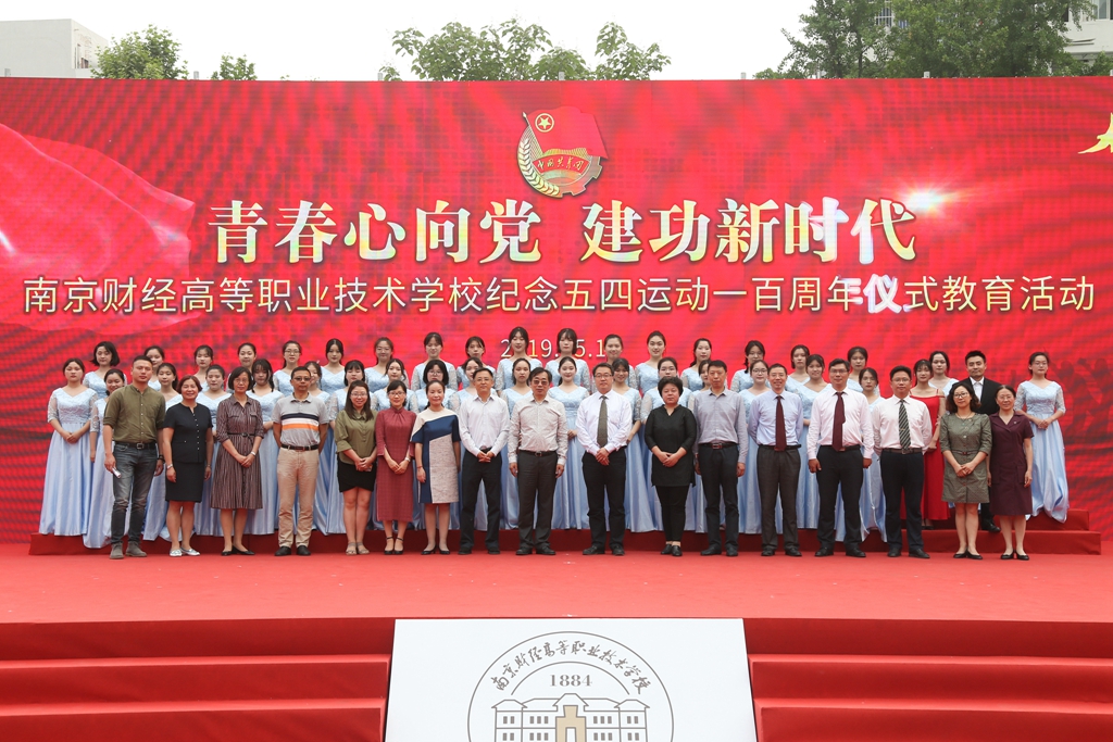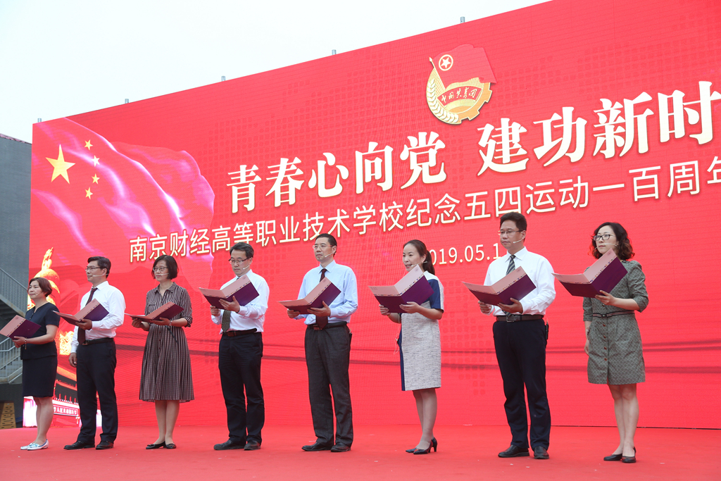 5月17日,我校在莫愁路校区体育场举行了一场以“青春心向党,建功新时代”为主题的纪念五四运动100周年仪式教育活动。江苏联合职业技术学院副院长陶向东、江苏联合职业技术学院学生处处长郭偌伶、南京市教育局职社处副处长刘建刚、南京市职教教研室副主任林德华以及校企合作的4位企业代表在学校校长姚峰、党委崔琪书记等9位校领导的陪同下,一起参与见证了仪式教育活动。活动包括新团员入团仪式、志愿者团队授旗仪式和成人礼三个主要环节。
