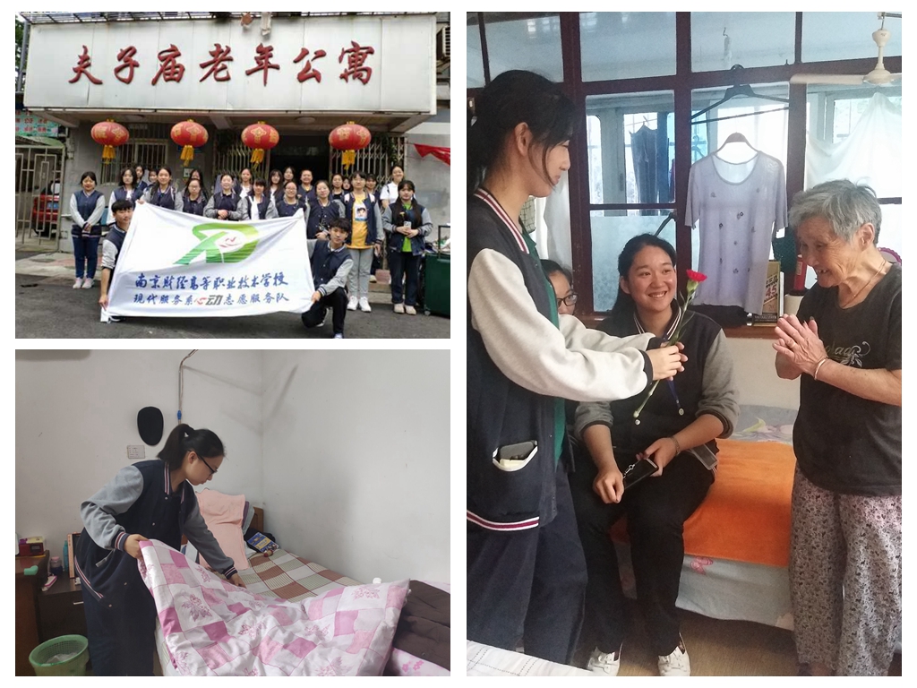 当天下午,现代服务系心动志愿者服务队的同学们来到了夫子庙老年公寓,为敬老院的老人们送去一份节日的祝福。同学们分为若干个小组,给老人们铺床叠被、打扫卫生,给老人们赠送鲜花,还为老人们表演了精彩的节目。
