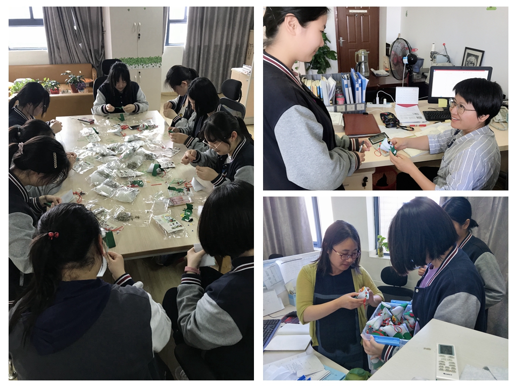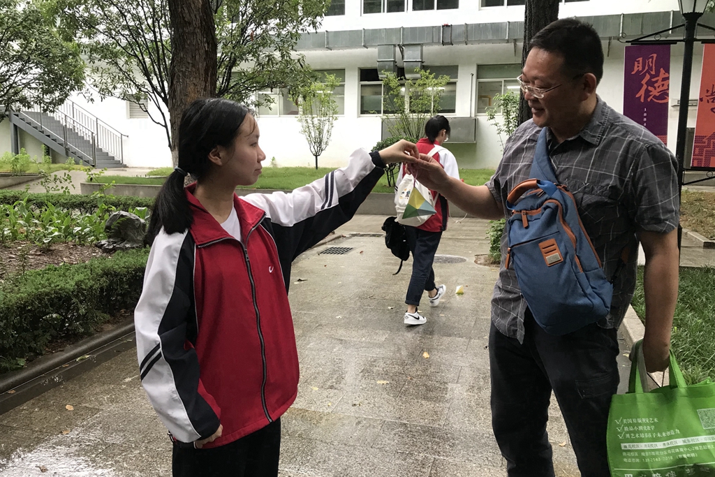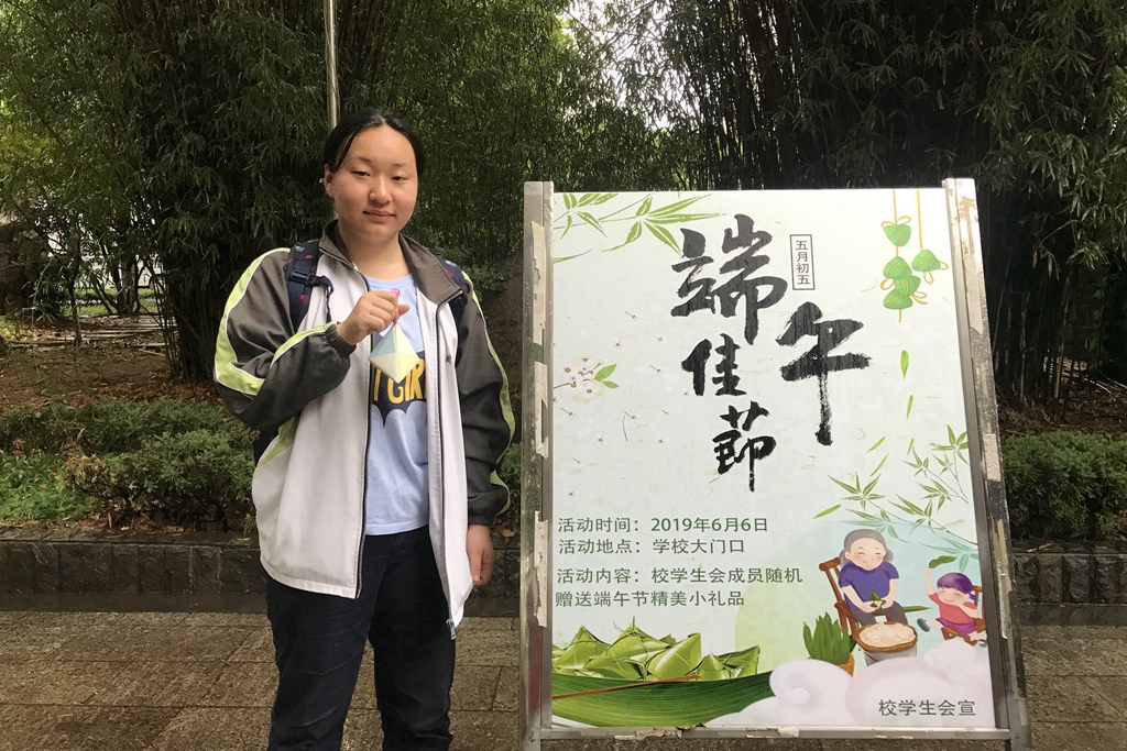 6月6日,校学生会同学提前用彩色卡纸折好了纸粽子,并用绳子串好,利用早晨时间在莫愁路校区进行了分发。尽管当天的天气不是很好,下着大雨,但丝毫不影响同学们的热情,他们亲手向每一位进校门的老师和同学送上了纸粽子与节日祝福。
