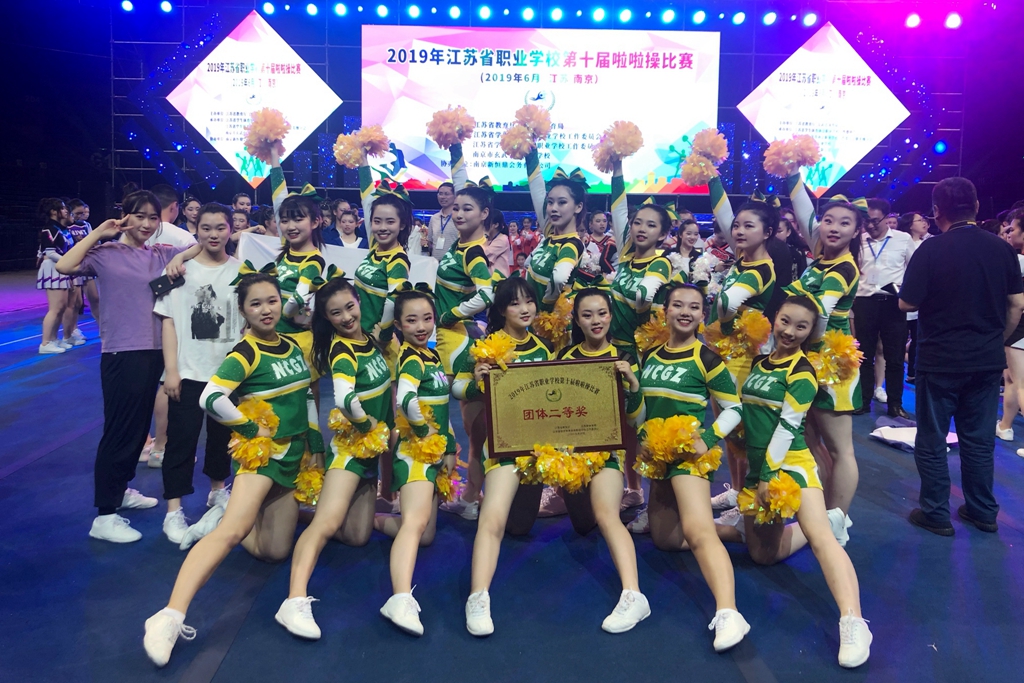 6月10至12日,2019年江苏省职业学校第十届啦啦操比赛在南京青奥体育公园举行。本次比赛由江苏省教育厅、江苏省体育局联合主办,来自全省13个市共计21支队伍参加了比赛。我校NCGZ啦啦操队凭借出色的表现荣获团体二等奖,教练孙蓬飞老师和潘渺琛老师荣获优秀教练员奖。