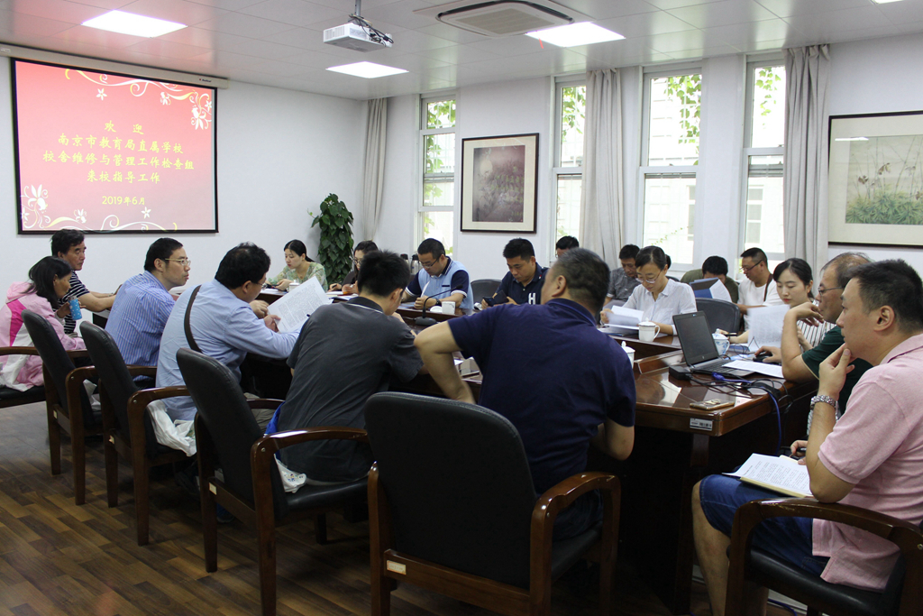为进一步提高中小学校舍修建与管理水平,南京市教育局开展了年度校舍修建与管理检查评估工作。6月18日上午,在学校李明庚副校长、后勤工作部朱春健主任、张炎副主任、万炜副主任的陪同下,由市教育局建设处、财务处、审计处和各直属学校总务主任组成的市教育局直属学校校舍维修与管理工作检查组来到学校莫愁路校区和新街口校区进行专项检查。检查组在会议室听取了本次校舍建设与管理的工作汇报。