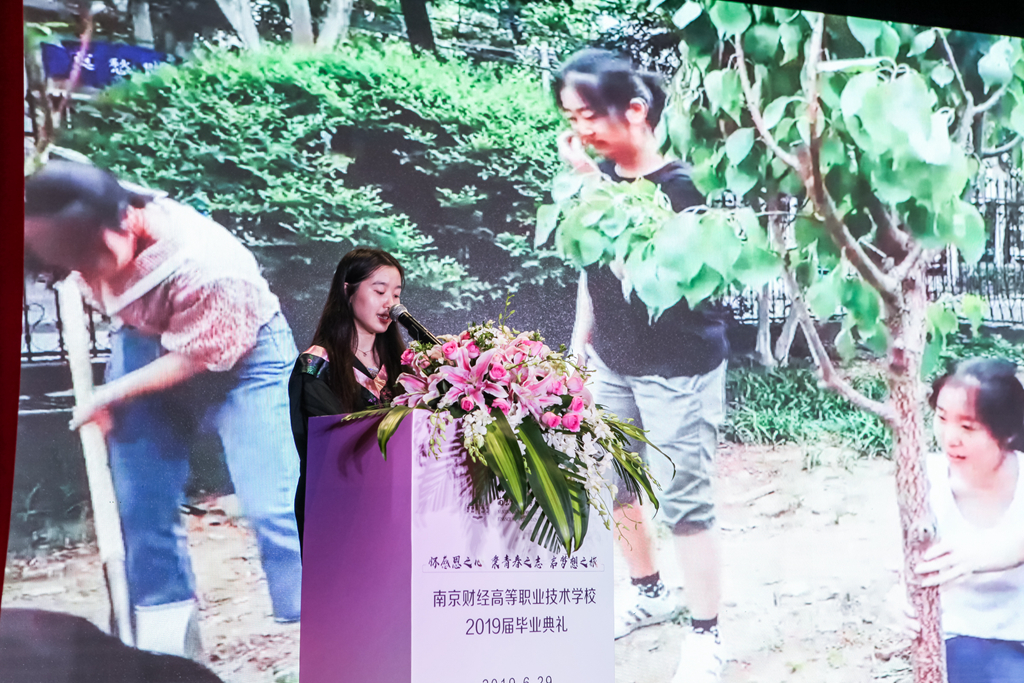 毕业典礼上,2019届各系毕业生为母校献上了具有不同寓意的礼物,信息艺术系运用专业知识,用Photoshop绘图软件、3dmax做出3d模型,再由3d打印机打出水晶雕刻的模型做出水晶雕刻成品,表达了对母校一片赤子之情;金融系为母校准备了屏风,屏风上面印着“桃李满天下,师恩似海深”;会计系在校园内栽种了一颗桃树、一颗李树,寓意桃李满天下,以此祝愿母校荣华照当年;现代服务系赠送了一副剪纸画,上面刻着南京财经高等职业技术学校的百年校训“明德尚美”,空中飞翔着几只白鸽,象征着学校将会依旧玉树临风。同时,学校也为同学们准备了一份特殊的礼物——毕业纪念视频,记录了同学们在校期间的精彩片段和留下的美好回忆。