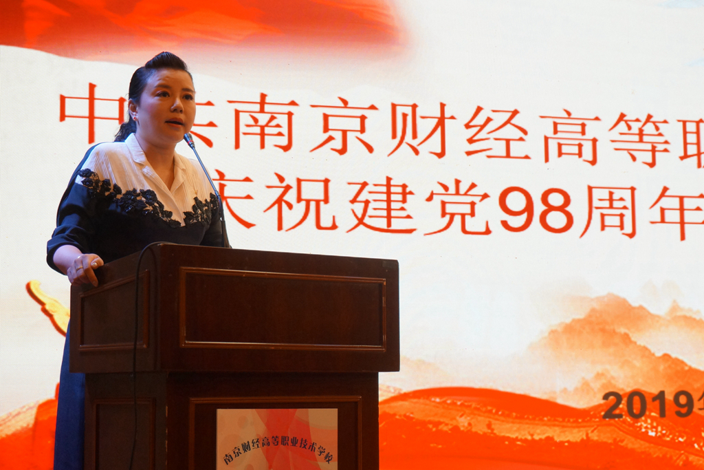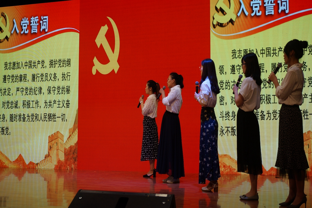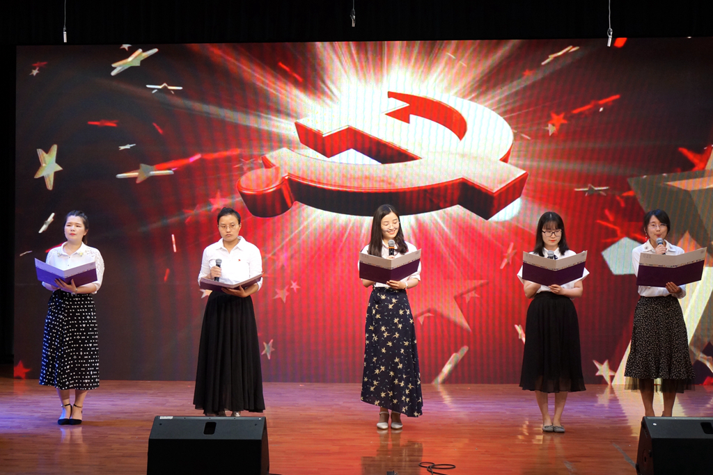 大会在庄严的国歌声中拉开了帷幕。“党旗引领教育梦,党员承诺先锋行”,在党委副书记许洁的带领下,学校新入职的五位青年党员面对党旗庄严宣誓,台下全体党员也重温了入党誓词,不忘初心,方得始终。随后,五位青年党员以诗朗诵《颂·党》,为党的生日献礼,她们用诗歌讲述着九十八年来,中国共产党带领中国人民历经考验、步步崛起,走向辉煌,也表达了奋力拼搏的财校人,将在光辉党旗的指引下,坚持“明德尚美、勤奋求真、敬业爱生、唯实创新”,不断共谋发展,再创辉煌。