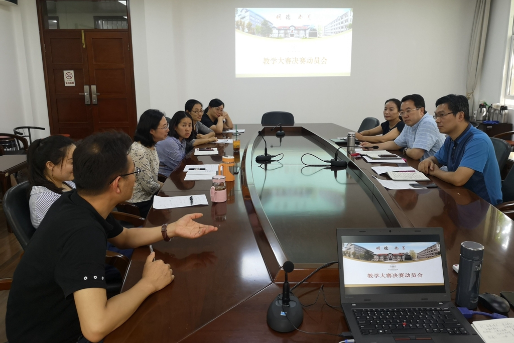 首先,张兆芃副主任对参赛教师团队赛前准备情况进行了详细介绍,并从教学工作部在大赛中的管理、指导及老师们的备赛状态等方面介绍了2019年教学大赛的工作情况。然后,数学教学团队代表郭海荣老师、英语教学团队代表成姝姝老师以及会计教学团队代表李金黛老师分别介绍了团队备赛情况。