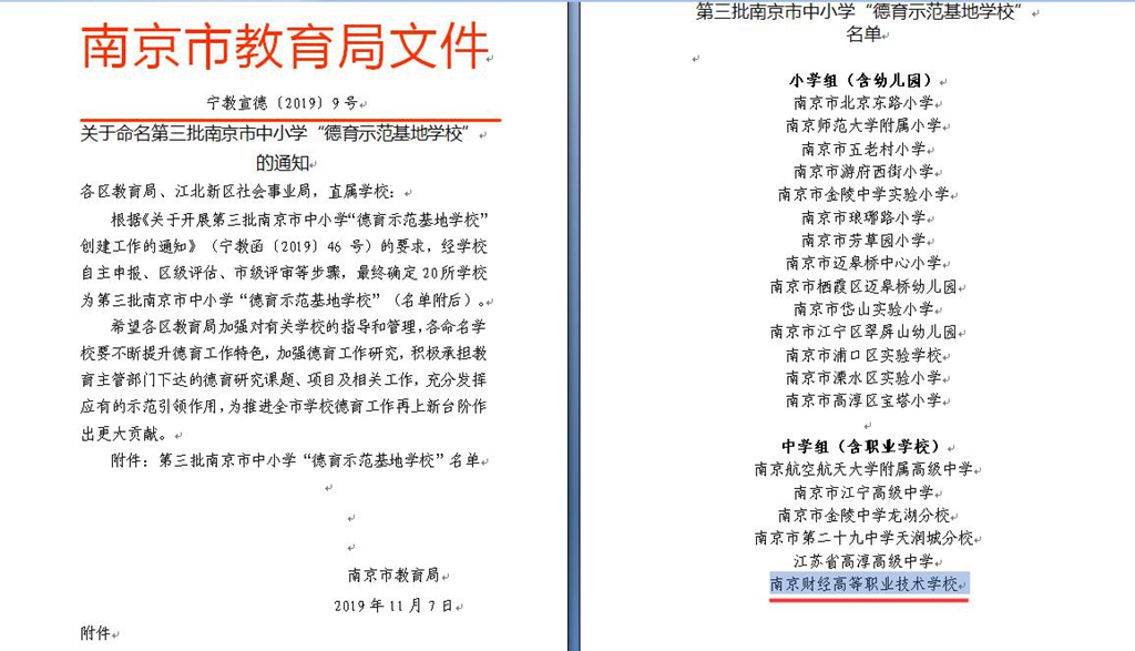 近日,我校顺利通过第三批南京市中小学中学组(含职业学校)“德育示范基地学校”评选,被授予“南京市德育示范基地学校”的称号,本次获批的职业学校仅我校一家。