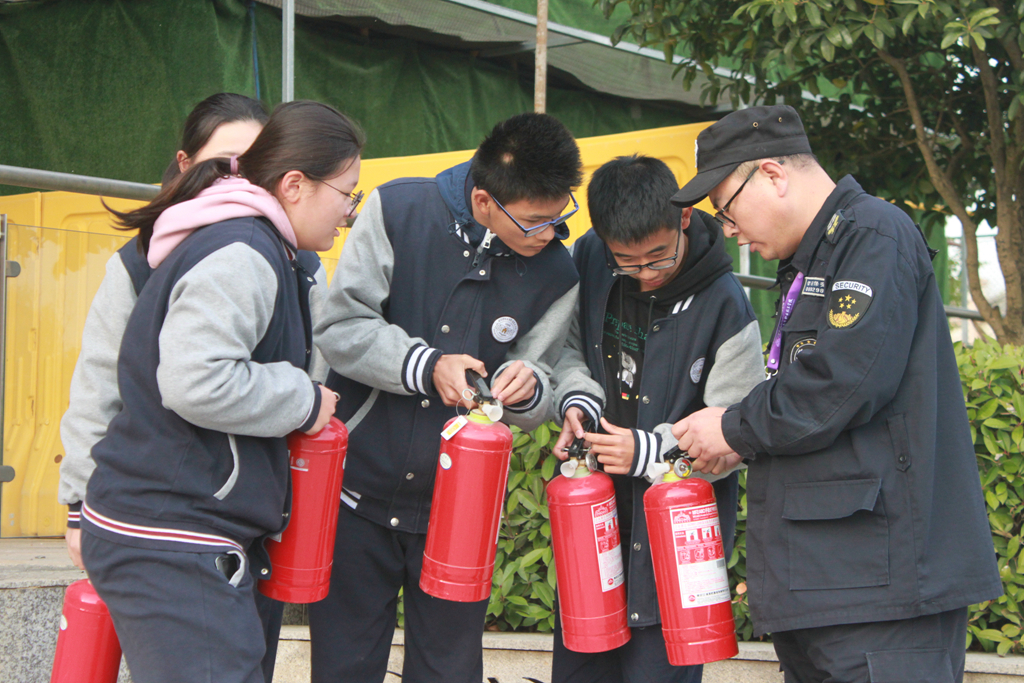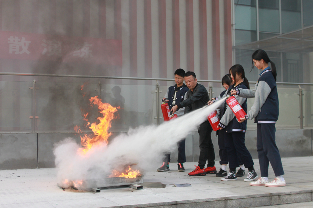 随后,安全工作部刘刚老师向全体师生讲解了灭火器的使用方法,并和微型消防站的义务消防队员一起做了示范。在他的指导下,学生代表、物业人员和宿舍管理人员等进行了灭火器使用的实际操作。