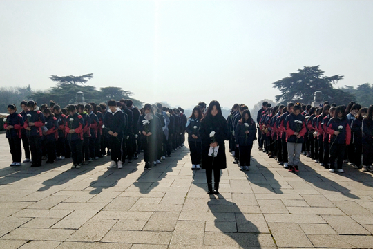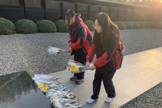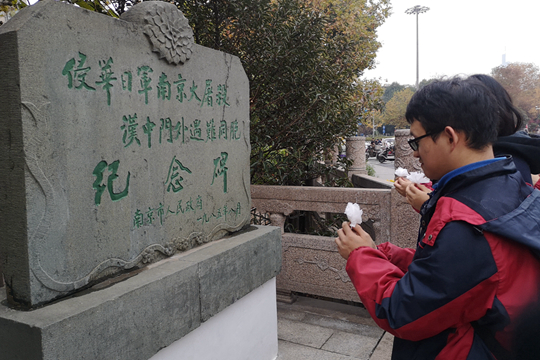 12月7日和11日,校团委学生会成员和现代服务系的同学分别前往南京雨花台烈士陵园和侵华日军南京大屠杀汉中门外遇难同胞纪念碑进行祭奠。同学们或手捧白菊,或手捧折纸,庄严肃静,饱含深情地向大屠杀遇难者进行默哀悼念,向长眠于此的革命烈士鞠躬、献花致意,以寄托对革命先烈的无限哀思。