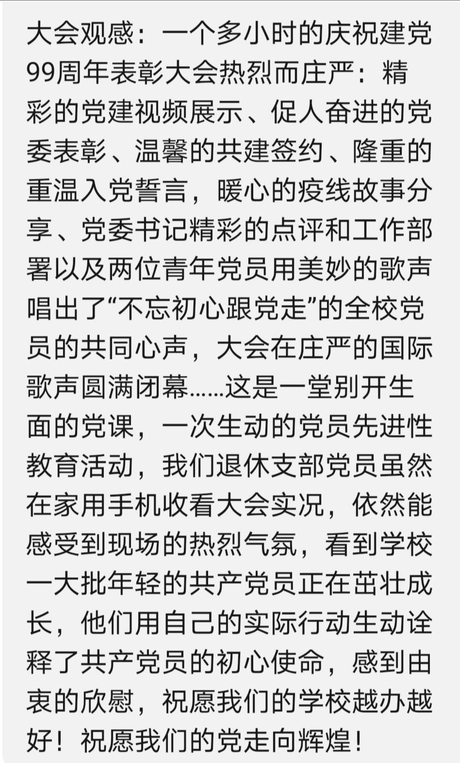 退休的党员老同志们在线观看了大会盛况后,深受鼓舞、倍感振奋,纷纷谈体会、谈感受,述说自己的心声。