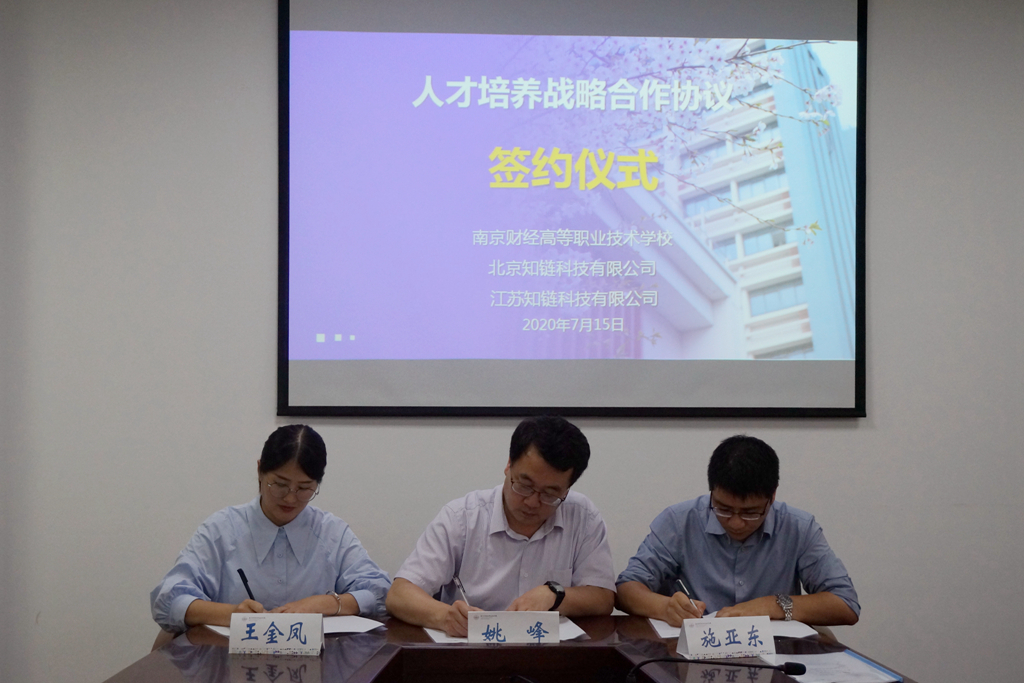 7月15日下午,江苏知链科技总裁施亚东携战略市场总监倪缪玲等一行来到我校,就区块链技术与学校金融系专业融合、创新创业教育等方面人才培养战略合作展开研讨。学校姚峰校长、崔琪书记、陈浩副校长、高磊副校长与金融系陈阳主任等共同出席签约仪式。