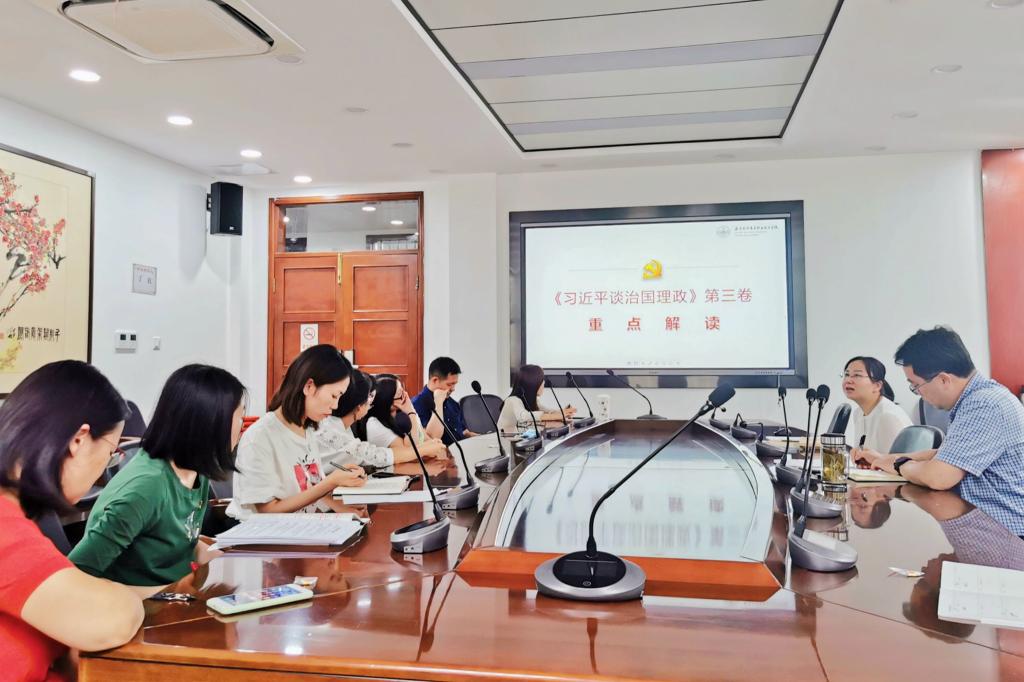 会上,各支部书记首先组织全体党员学习了《习近平谈治国理政》第三卷,对党的十九大以来科学理论新发展新内容进行了深入解读。学好用好《习近平谈治国理政》第三卷对于深入领会学习习近平新时代中国特色社会主义思想,进一步掌握贯穿其中的马克思主义立场观点方法,深刻理解中国共产党为什么“能”、马克思主义为什么“行”、中国特色社会主义为什么“好”,切实增强“四个意识”、坚定“四个自信”、做到“两个维护”,具有重大而深远的意义。党员们在支部书记的带领下,“读原文,学原理,悟行动之道”,大家表示要以强烈的社会责任感,学好《习近平谈治国理政》第三卷,切实把学习成效转化为增强“四个意识”、坚定“四个自信”、做到“两个维护”的行动自觉。