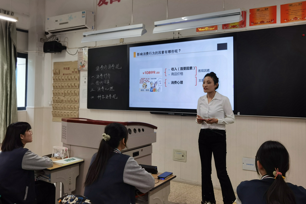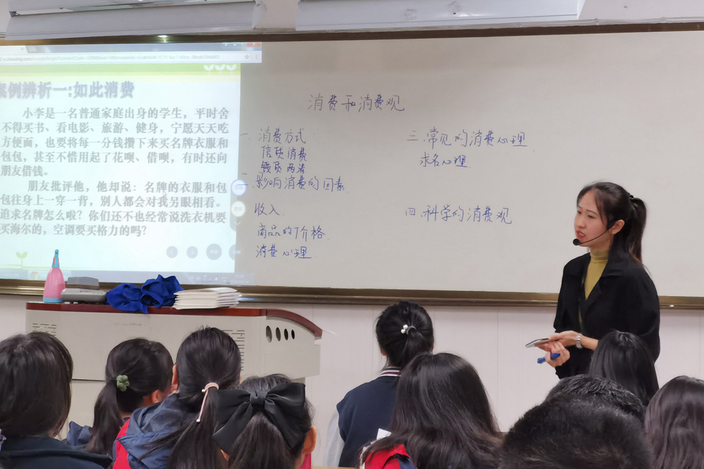 公开课上,两位新教师演绎了不同的精彩。焦一曼老师主要采用了情境教学法,通过创设情境、角色扮演、学生讨论、教师引领的方式,带领学生探究消费心理,帮助学生树立正确消费观;张珣老师主要采用案例教学法的方式,通过四个典型经典案例,结合国庆期间的家庭消费问题,组织学生用小组讨论的形式去研究消费心理,引导学生形成正确消费观念。
