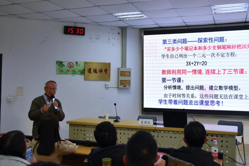 接着,吕传汉教授从30年的实践探索与理论构建切入,带来了一场题为《“三教”引领学科“情境——问题”教学促进学生“长见识、悟道理”研析》的学术报告。“三教”,指教思考、教体验、教表达。吕教授语言幽默,讲解深入浅出,让老师们轻松而深刻地了解了“三教”理论。基于现代社会发展的新特征,吕教授提出了新时代对创新人才的需求及新时代课堂学习要求——长见识、悟道理,并阐述了“情境—问题”基本教学模式,结合生动详实的教学案例,赋予“三教”富有生命力的内涵,让核心素养在数学课堂落地生根。同时,吕教授结合2018年基础教育国家级教学成果奖一等奖获奖案例,剖析核心素养的培育途径和方法。学术报告最后,老师们积极提出关于“三教”的疑惑,吕教授都耐心地答疑。报告近3个小时,吕教授全程站着讲授。在场老师均表示吕教授这样的专业精神和大师风范值得我们每一个人学习。
