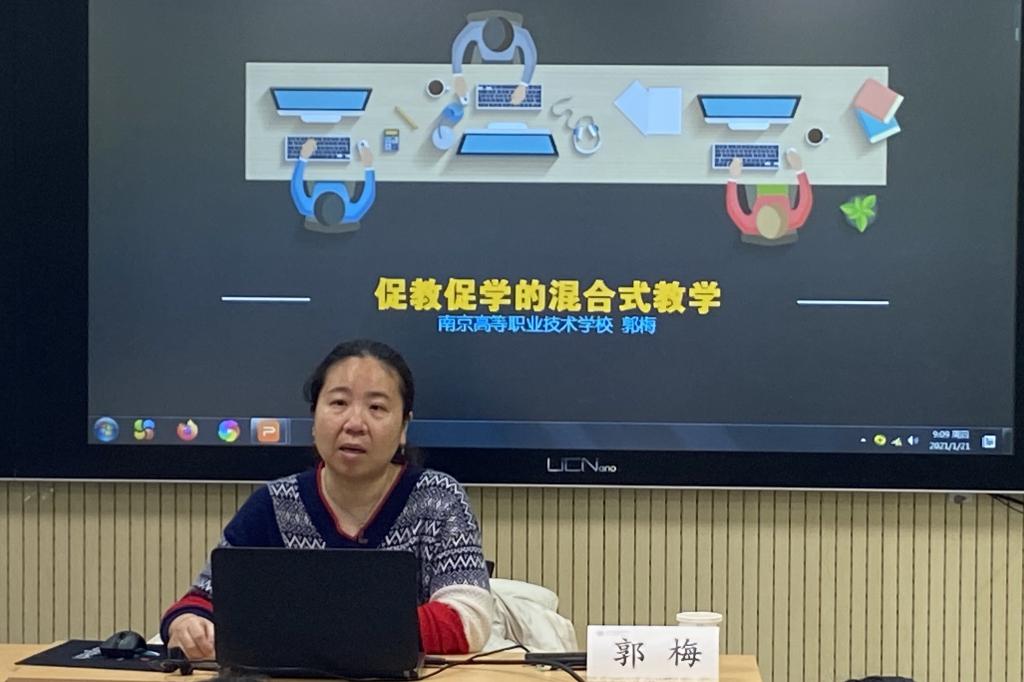 1月21日上午,南京高等职业技术学校郭梅副教授为老师们做了题为《促教促学的混合式教学》的专题讲座。她从“教”和“学”两方面深入浅出地讲解了什么是混合式教学,并用多个生动有趣的案例视频指导大家如何进行混合式教学。研修班学员们积极互动,与专家一起探讨形式多样的线上授课方法。