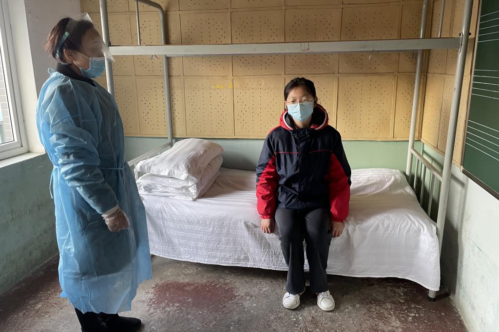 夜间值班校医接报后,戴医用口罩、手套、帽子、防护面屏,穿隔离服、胶鞋及时到达现场,在宿舍走廊对发热学生进行询问,并用水银温度计再次测量体温,两次腋温均超过37.3℃。宿管人员戴医用口罩、手套、帽子、防护面屏,穿隔离服、胶鞋通过发热通道将学生移送到隔离室。宿管人员在隔离室值班间全程陪护学生,直到家长到校。