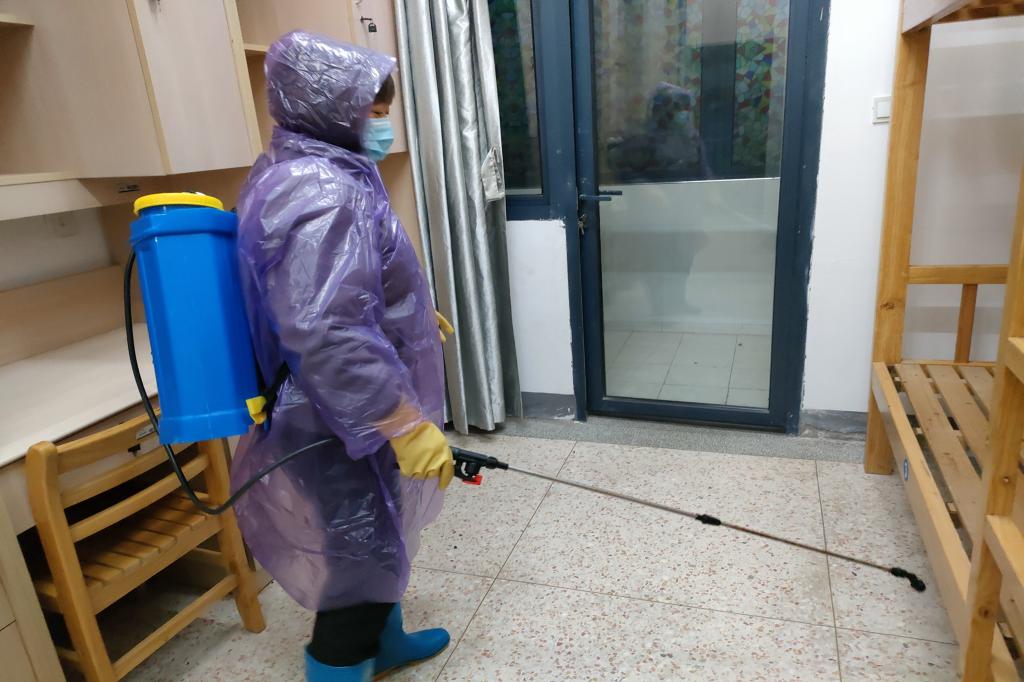 后勤保障组用装有调配好的84消毒液消杀罐对宿舍及走廊等公共区域进行消毒,并用酒精对门把手和座椅等进行擦拭消毒。
