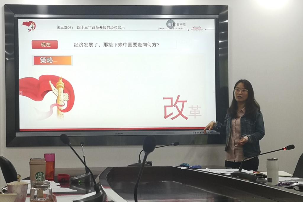 史有萍、周龙两位老师在第一次磨课的基础上再次进行了说课汇报。史有萍老师以《改革开放43年》为题,重点展现了改革开放的历史进程、经验启示。周龙老师以“四史”学习教育为题,从什么是“四史”,为什么学“四史”,如何学“四史”进行了交流。说课结束后,学校思政课专家冯冬梅主任、黄菲主任和成倩主任针对这两节党课的容量、结构、脉络等提出了切实中肯的意见,指出党课要进一步聚焦切入点、要能激发学习兴趣、内容选择要严谨准确,并对党课推荐选题做了深入剖析,为后续磨课做了布置和安排。三位专家的指导深入浅出、内容丰富、史料翔实、语言生动,青年骨干教师们深受教育、深受启发。最后,校纪委书记朱辉指出,青年骨干教师要严格按照培训班要求,保质保量完成各项任务,特别强调要在党史学习教育和“四史”专题教育中发挥青年骨干教师的先锋作用。