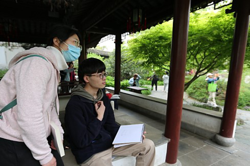 活动伊始,解说员冯老师带领同学们边讲解边参观了太平天国历史博物馆及瞻园,为同学们介绍了太平天国运动和瞻园的历史背景。通过冯老师的介绍,同学们了解到太平天国运动不仅是中国历史上第一次在南方兴起,进而影响全中国的农民战争,也是世界历史上规模空前的农民战争,历时14年,达到了旧式农民战争的最高峰;而素以假山著称的瞻园,为乾隆南巡时题名,取苏东坡“瞻望玉堂,如在天上”之意,太平天国时为东王府和夏官丞相衙署。讲解中,冯老师在现场为同学们一一解答疑惑。穿过百年的长廊,轻吹一口气,便能扬起明清历史的尘埃,每一处都是文物,每一景都有故事,充分激发了同学们写生的热情和兴趣,纷纷跃跃欲试。