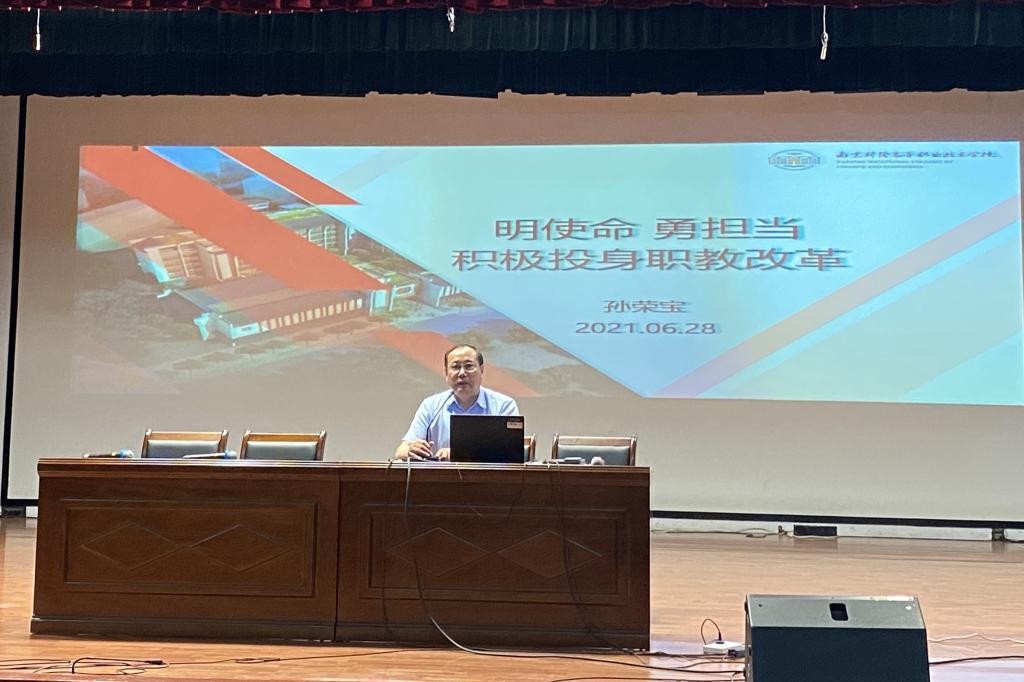 然后,孙荣宝副校长以“明使命勇担当——积极投身职教改革”为主题发表讲话。孙副校长从政策解读着手,着重解读了“三教”改革的内涵,明确新时代职校教师的使命担当——解决好培养什么人、怎样培养人、为谁培养人的问题。孙副校长提出了落实立德树人、促进学生成长的根本任务,并从教学大赛、技能大赛、教研活动、技能展美节等方面提出了具体要求。