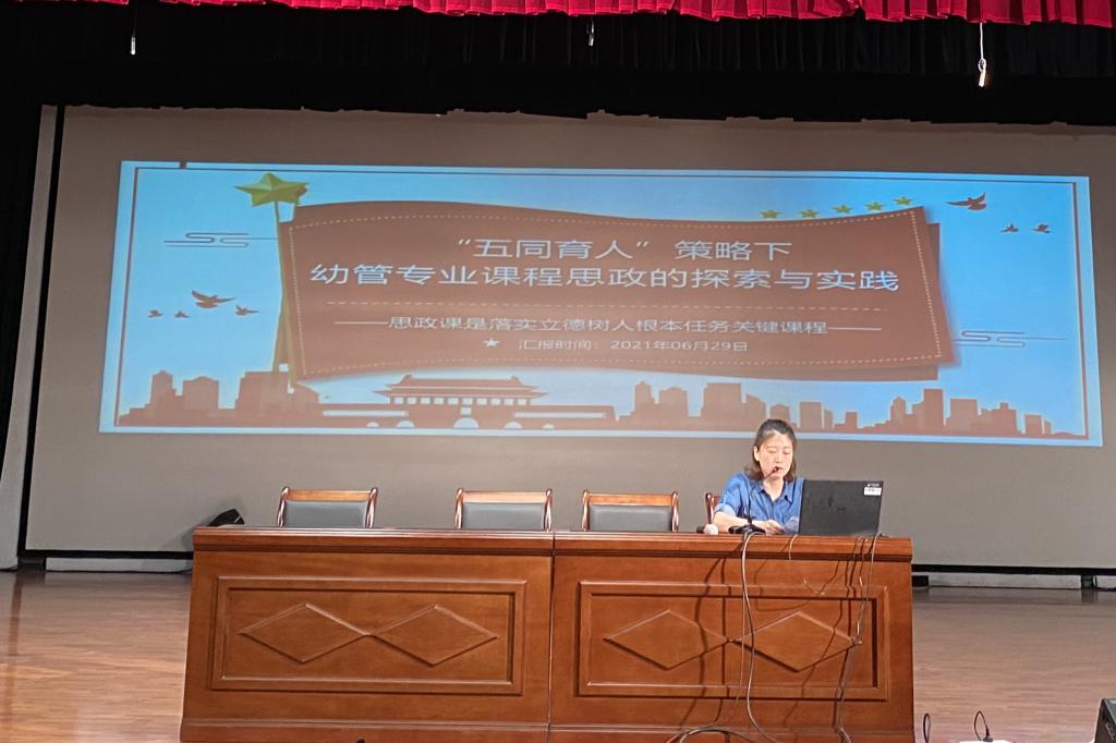 幼儿发展与健康管理教研室主任何莲莲分享了该专业五同育人理念的构建及推进。何主任以幼管专业课幼儿心理学为例,阐述课程思政系统化体系。教师应按章节梳理知识点,挖掘提炼思政元素,确定思政教育目标。在教学设计中,应遵循思政规律,学生学习规律,结合案例达到思政目标。何主任举例各专业课课程思政点的挖掘和融入方式,向在座各位展示了课程思政的具体路径。