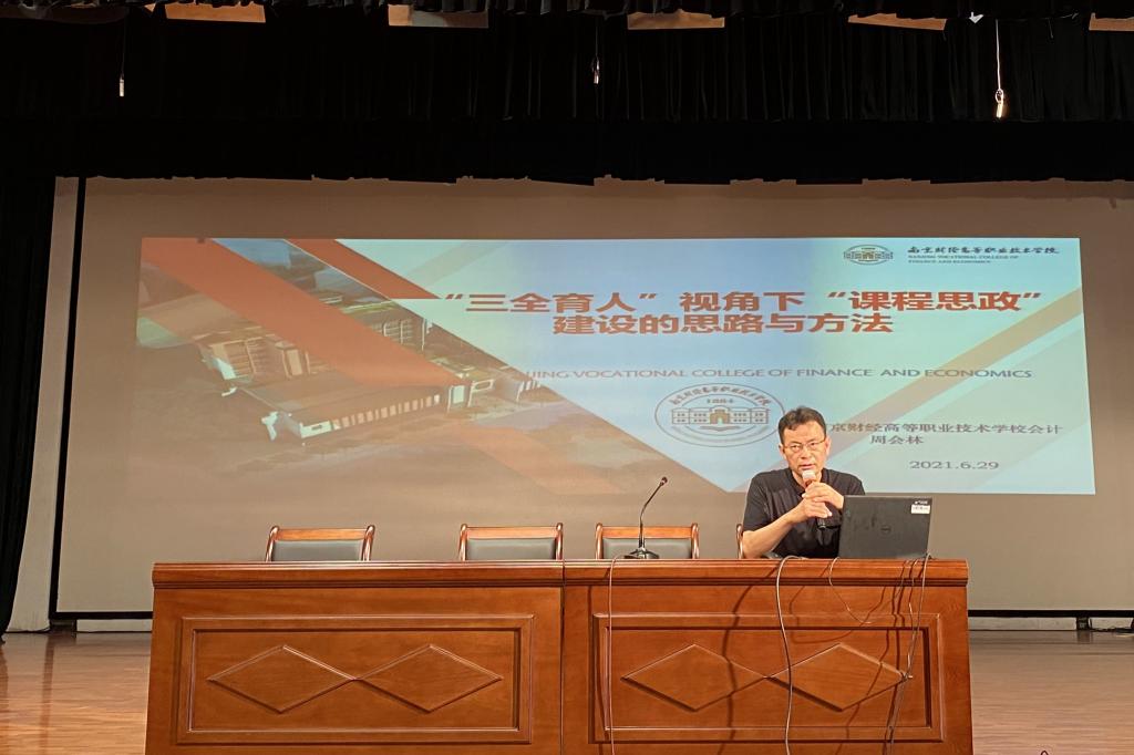 首先,会计系周会林主任作了题为《“三全育人”视角下课程思政的建设思路与方法》的讲座,提出要做好顶层设计,强化育人理念,丰富教学方式,注重隐形育人、协同育人,关注学生信息多元化渠道。周主任主持的《真账实训》课程被列为省级课程思政示范课程项目,他在会上分享了该项目的建设经验。