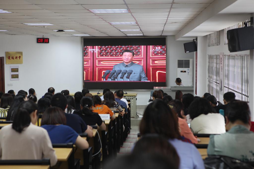 大会在隆重的国歌声中开幕。随后,全体党员在校党委书记崔琪的带领下重温入党誓词。“我志愿加入中国共产党,拥护党的纲领,遵守党的章程”一句句誓言铿锵有力,在会场回荡。上午8时,中共中央在北京隆重举行庆祝中国共产党成立100周年大会,中共中央总书记、国家主席、中央军委主席习近平出席庆祝大会并发表重要讲话。学校全体党员全神贯注,认真观看了现场直播。