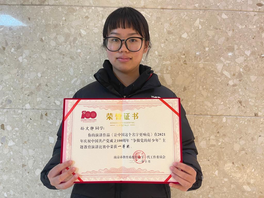 “唱支山歌给党听,我把党来比母亲。母亲只生了我的身,党的光辉照我心……。”6月12日,南京市教育系统关心下一代工作委员会组织举办了2021年庆祝中国共产党成立100周年“争做党的好少年”主题教育演讲比赛,我校孙文静同学代表学校参赛。10月下旬,获奖结果公布,孙文静同学凭借原创作品《让中国这个名字更响亮》取得了第一名的傲人佳绩。