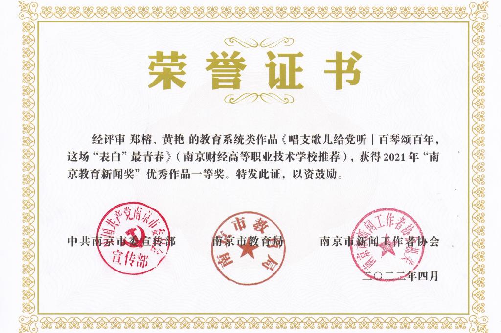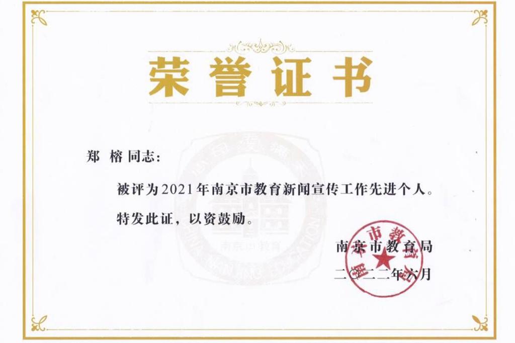6月22日上午,2022年南京市教育新闻宣传工作会议顺利举行。会议回顾了2021年南京教育系统新闻宣传工作在各方面取得的成绩,对2021年全市教育新闻宣传工作先进集体、先进个人及优秀教育新闻作品进行了公布和表彰。由于在宣传工作中的出色表现,我校再获“2021年南京市教育新闻宣传工作先进集体”荣誉称号,学校校务工作部郑榕主任获评“2021年南京市教育新闻宣传工作先进个人”荣誉称号。学校报送的新闻作品《唱支歌儿给党听∣百琴颂百年,这场“表白”最青春》喜获“2021年‘南京教育新闻奖’优秀作品一等奖”。