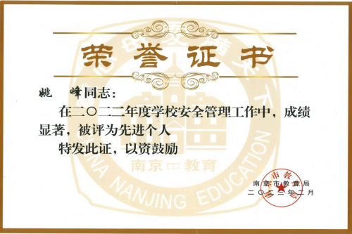 近日,南京市教育局公布了“2022年学校安全工作综合考评结果”,学校荣获“2022年度学校安全工作优秀单位”,姚峰校长荣获“2022年度安全管理工作先进个人”。
