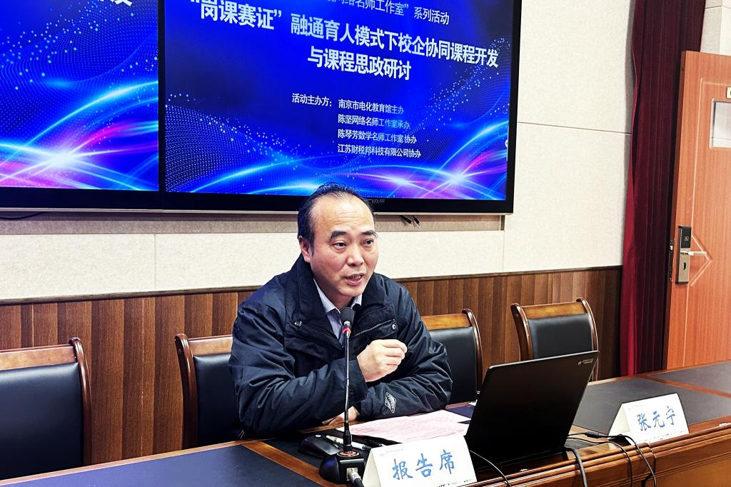 为贯彻落实《省教育厅关于印发江苏省中小学网络名师工作室管理办法的通知》精神,南京市电化教育馆决定开展南京市“省级网络名师工作室”系列活动。江苏省陈坚网络名师工作室积极响应,2022年12月2日主办了“岗课赛证”融通育人模式下校企协同课程开发与课程思政研讨,并通过省名师网络平台和金陵微校平台直播。活动由会计系周会林主任主持。