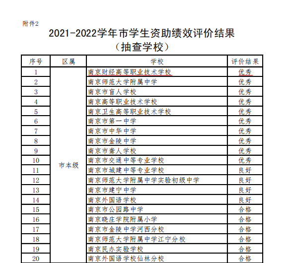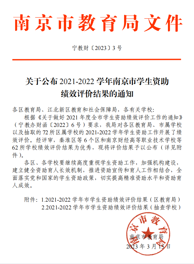 近日,南京市教育局印发《关于公布2021-2022学年南京市学生资助绩效评价结果的通知》(宁教财〔2023〕3号 ),学校在2021年度南京市学生资助绩效评价工作中获评优秀。
