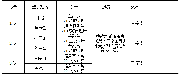 蜂群舞蹈编程赛项要求2名选手组成一队,须自带符合规则要求的旋翼类飞行器及其他必要设备参赛。参赛队伍需自行选定音乐,结合比赛题卡进行程序设计与编写,最终进行一段无人机多机编队舞蹈的展示。本次比赛采取现场赛的形式,学校创新小组的6名同学分别组成3支队伍,凭借扎实的飞行基本功、娴熟的无人机编程技术以及过硬的心理素质,与来自全省的其他28支队伍进行激烈角逐,最终不负众望,取得了好成绩。