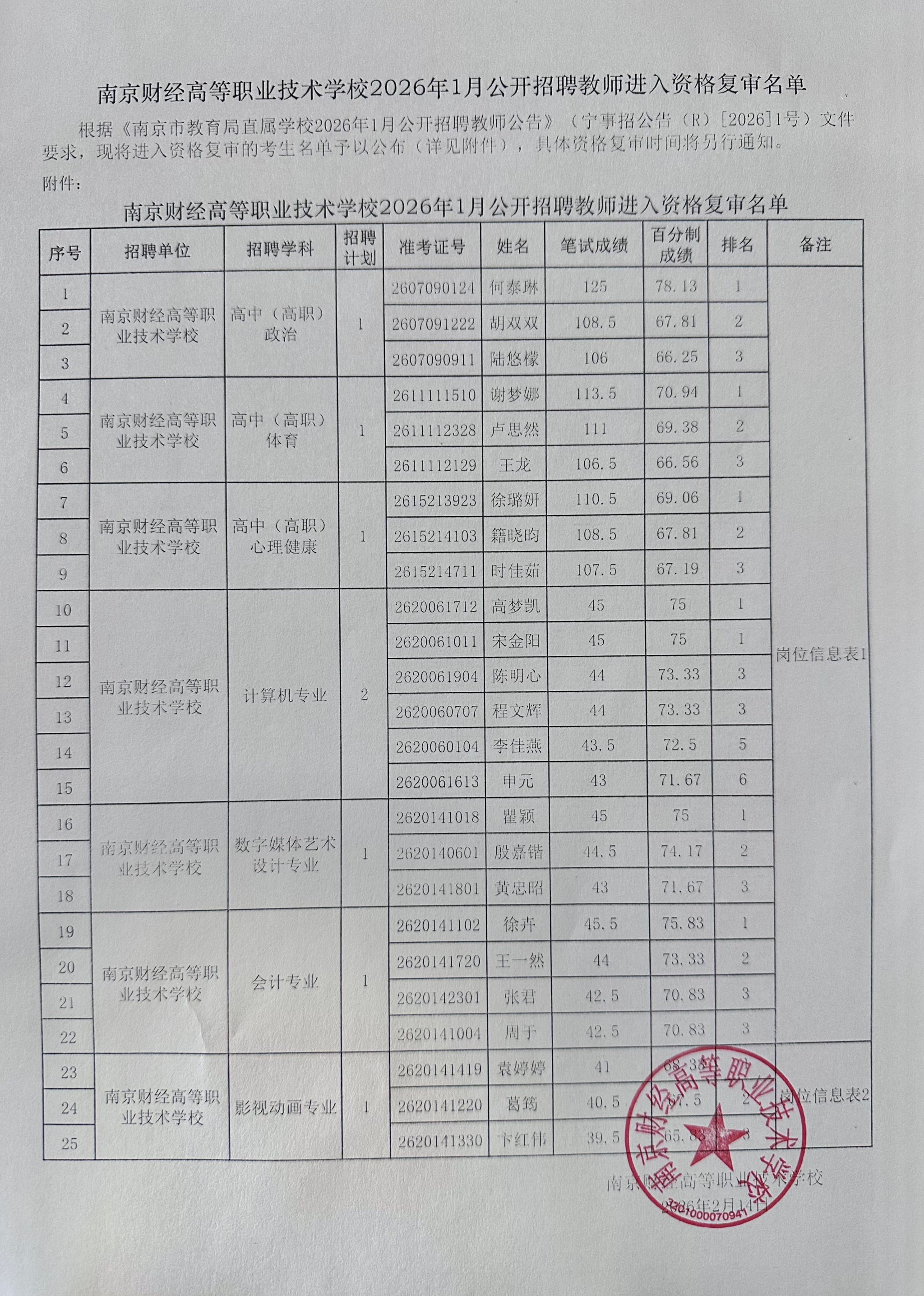 南京财经高等职业技术学校2026年1月公开招聘教师进入资格复审名单