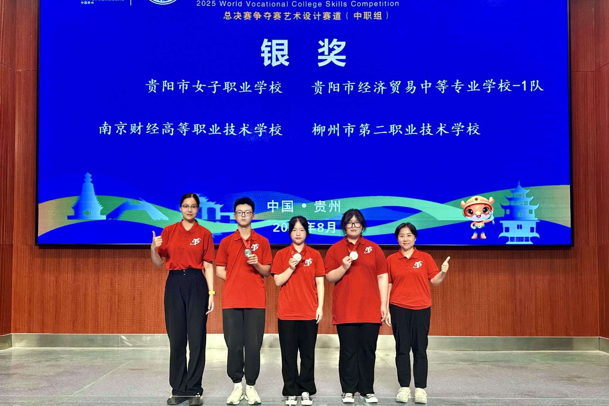 8月23-29日,2025年世界职业院校技能大赛总决赛争夺赛(中职组)艺术设计赛道在贵阳举行。由信息艺术系谢嘉琪、钟雨露、宗新睿组成的学生团队,在学校副校长薛飞带队,沙牧秋、蒋云娇老师指导下,凭借精湛技艺与默契协作,从全国114支参赛队中脱颖而出,斩获银奖。